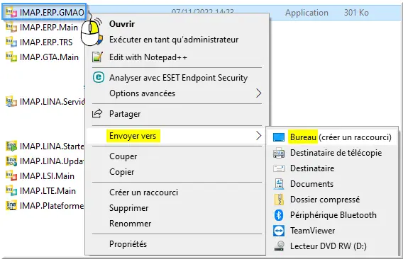 - Rechercher IMAP.ERP.GMAO, faire clic droit > menu contextuel "Envoyer vers" > "Bureau".