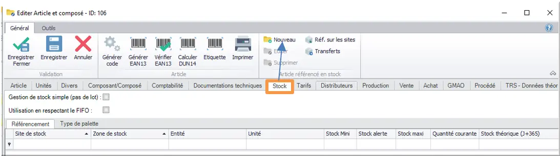 - Une fois l’article enregistré, accéder à l’onglet Composant/composé et cliquer sur Nouveau.