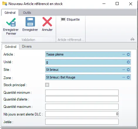 - Pour pouvoir enregistrer la fiche article, il faut saisir un code et un EAN13, sinon cliquer sur Générer code puis Générer EAN13 pour une attribution automatique ;